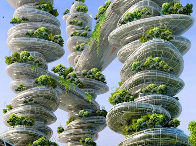 Des bâtiments et une architecture qui vise à limiter voire diminuer notre impact sur notre environnement : des tours avec un chauffage et un refroidissement passif, rétention de l’eau de pluie sont autant de moyens pour en faire des unités autonomes. A cela s’ajoutent des jardins suspendus, des nombreux espaces verts. Ces bâtiments futuristes combineront aussi bien des logements que des bureaux et des commerces afin de limiter les transports et la consommation d’énergie.